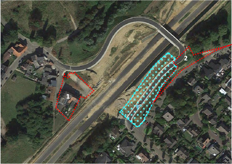 Onderstaande afbeelding toont een luchtfoto met de globale begrenzing van de plangebieden. Het blauw omkaderde gebied is het gedeelte waarvoor reeds een omgevingsvergunning is verleend in het kader van de aangepaste omleiding Merkelbeekerstraat. Dit gedeelte vormt samen met de rood omlijnde gebieden het plangebied.